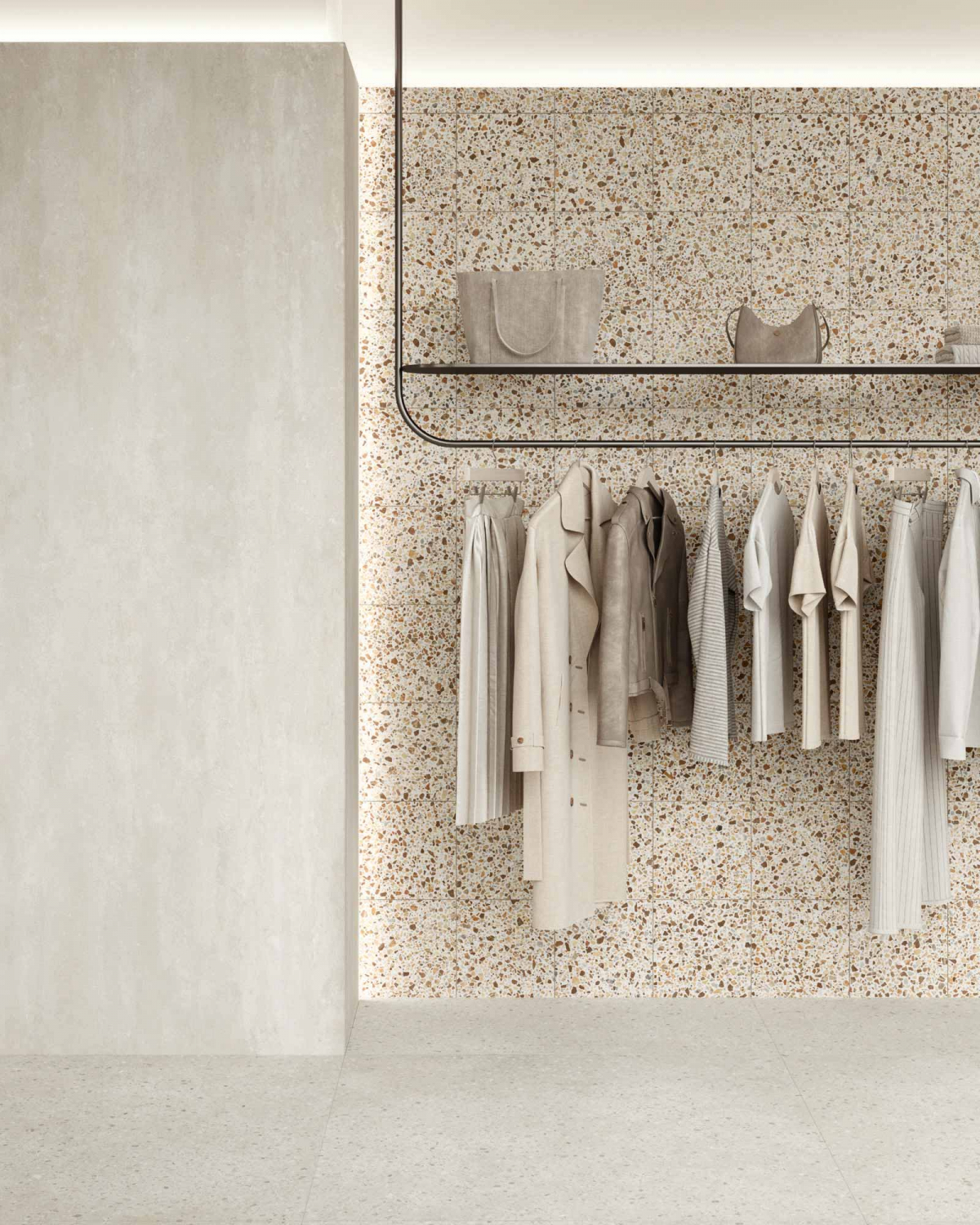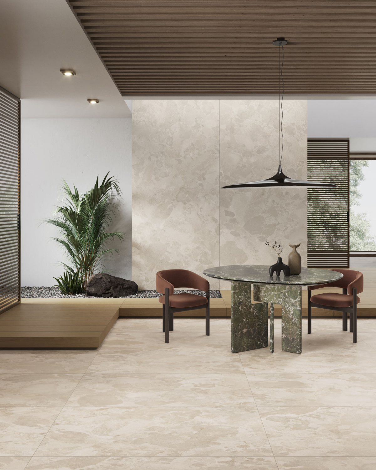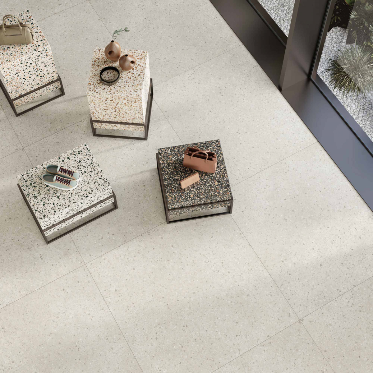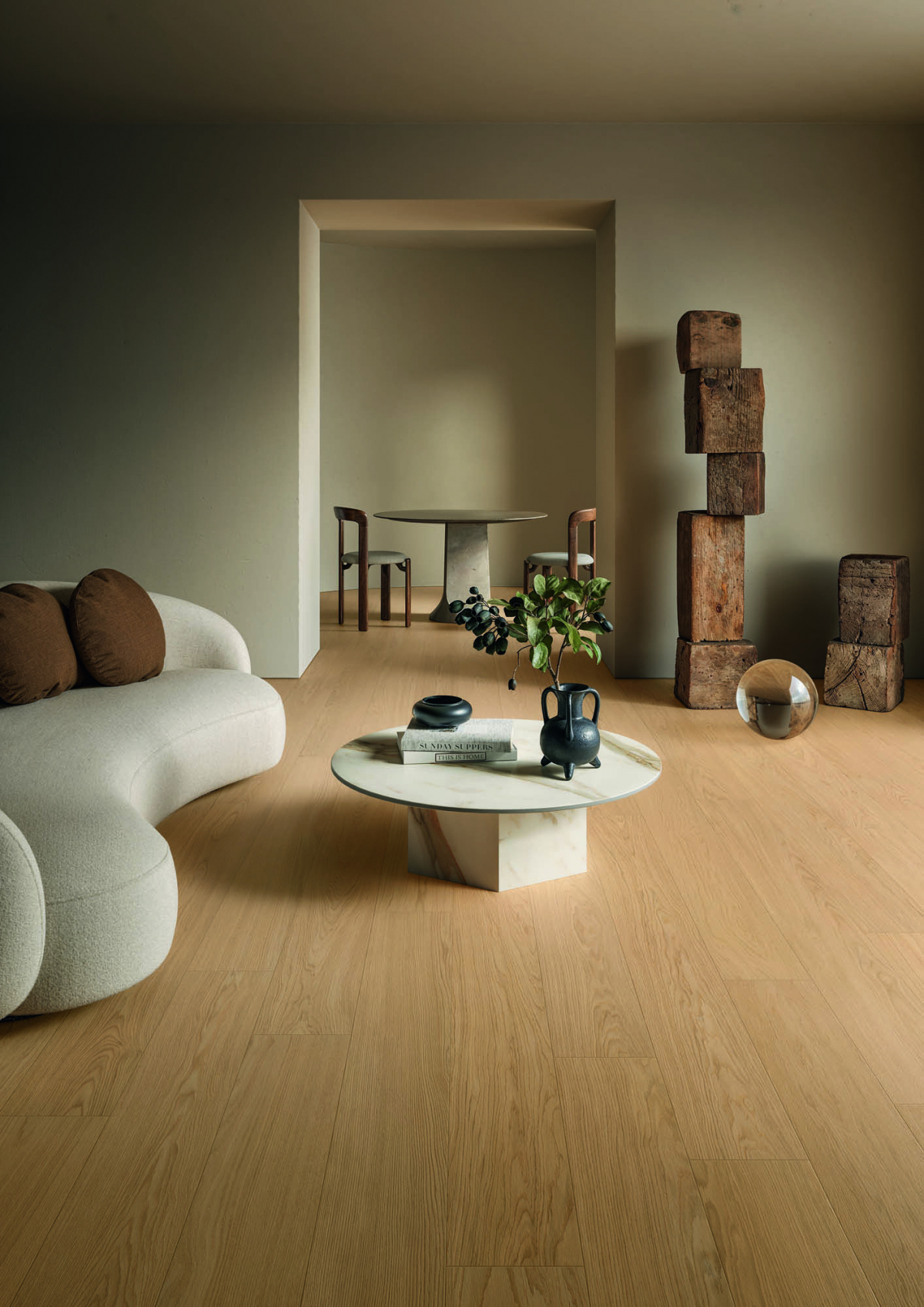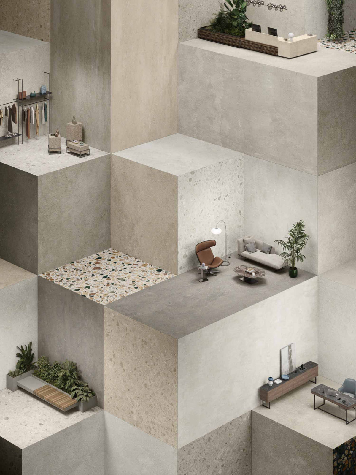 Architettura e materia dialogano in chiave essenziale e armonica, con un linguaggio visivo misurato. I colori naturali, le texture sobrie e la forza discreta del gres porcellanato danno vita a un paesaggio interiore fatto di equilibrio, continuità e tracce leggere.