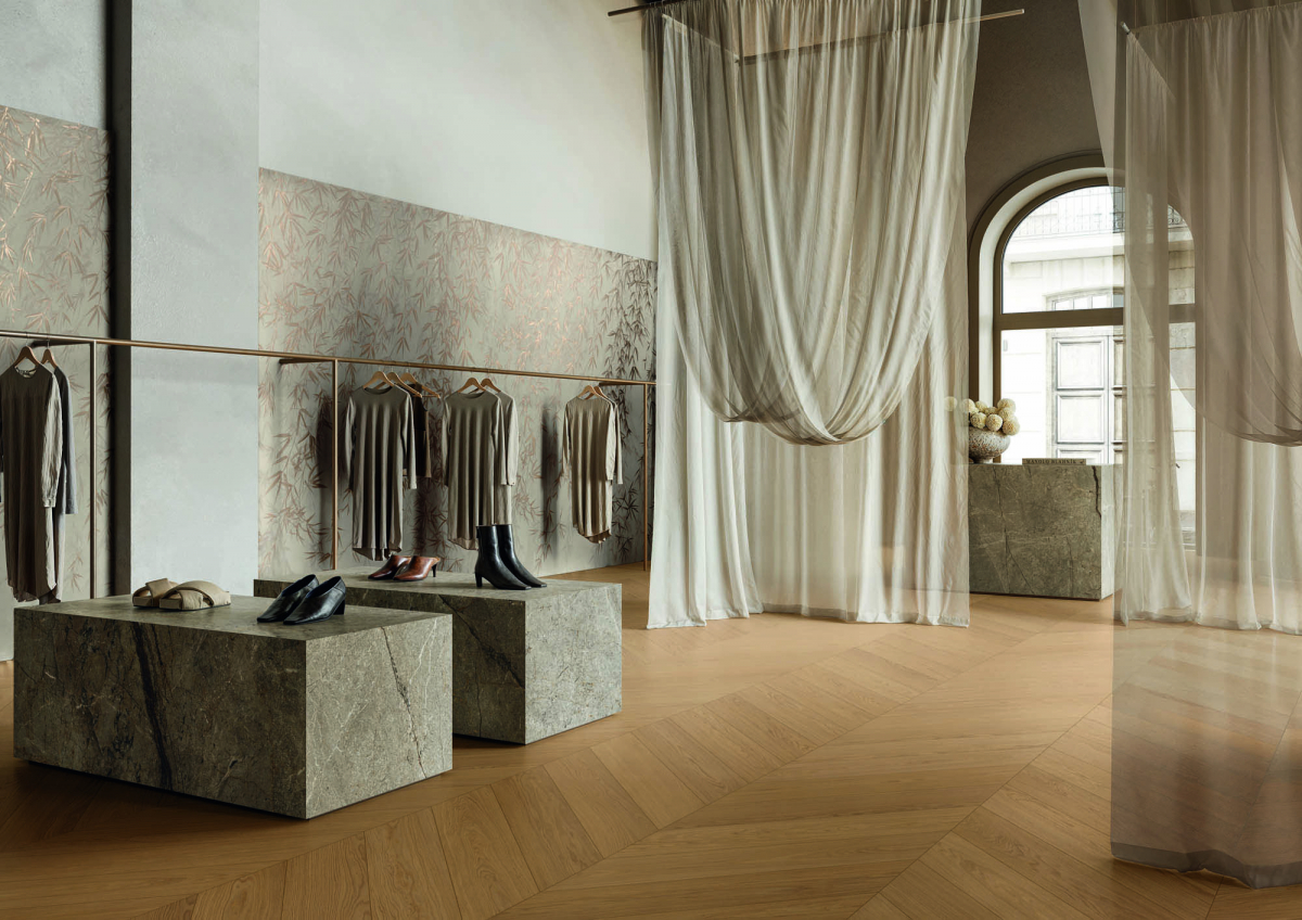 CiViC affronta l'effetto cemento articolandosi in tre varianti distinte, con un progetto di stile ispirato alle influenze urbane contemporanee. Bloomstone è una collezione effetto pietra costruita sull'equilibrio tra forza e delicatezza. Le tonalità si intrecciano in un dialogo cromatico sottile che dà vita a un tessuto materico elegante e raffinato, con profondità e sfumature che richiamano tracce modellate dal tempo. Pure nasce dallo studio attento del legno naturale e da una ricerca orientata a individuarne l'essenza più nobile, esprimendo un'attitudine costante alla sperimentazione nell'osservazione della natura come modello di riferimento. Haven si muove nello stesso territorio materiale, con un proprio registro progettuale.
