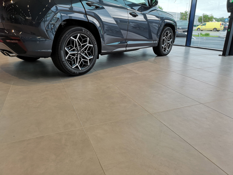 Tattilità e struttura attraversano anche le 10 differenti colorazioni, proposte in 7 formati e 3 spessori: dalle avvolgenti sfumature del grigio, scivolando verso il bianco etereo e il nero totalizzante, e comprendendo tre accenti di colore. Per questo progetto, la scelta cromatica è caduta su Levity, nel formato 60x120 cm, una tonalità eterogenea di grigio chiaro capace di ammortizzare i riflessi di luce grazie alla sua morbida superficie. Levity esalta i colori delle vetture esposte, trasmettendo, al contempo, una piacevole sensazione di comfort e di pulizia a tutto l’ambiente circostante.