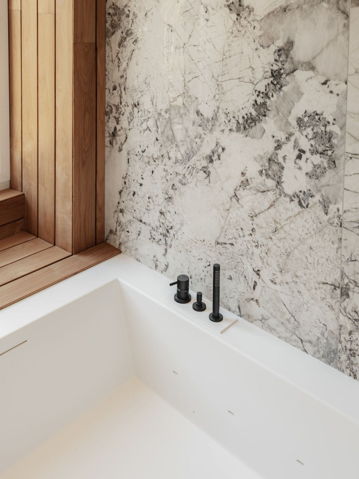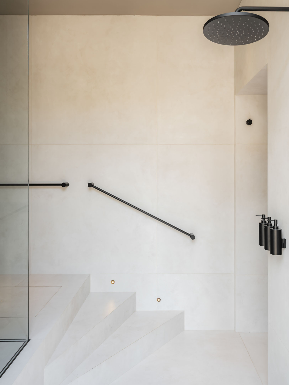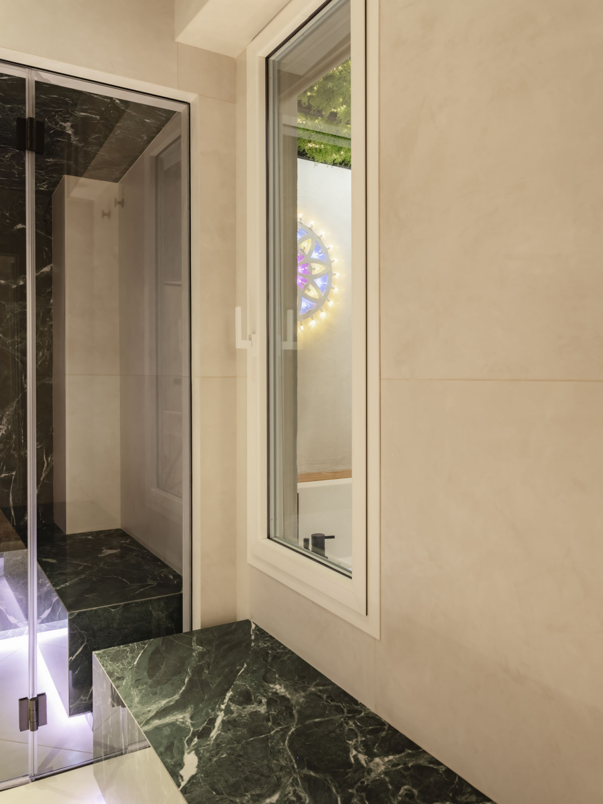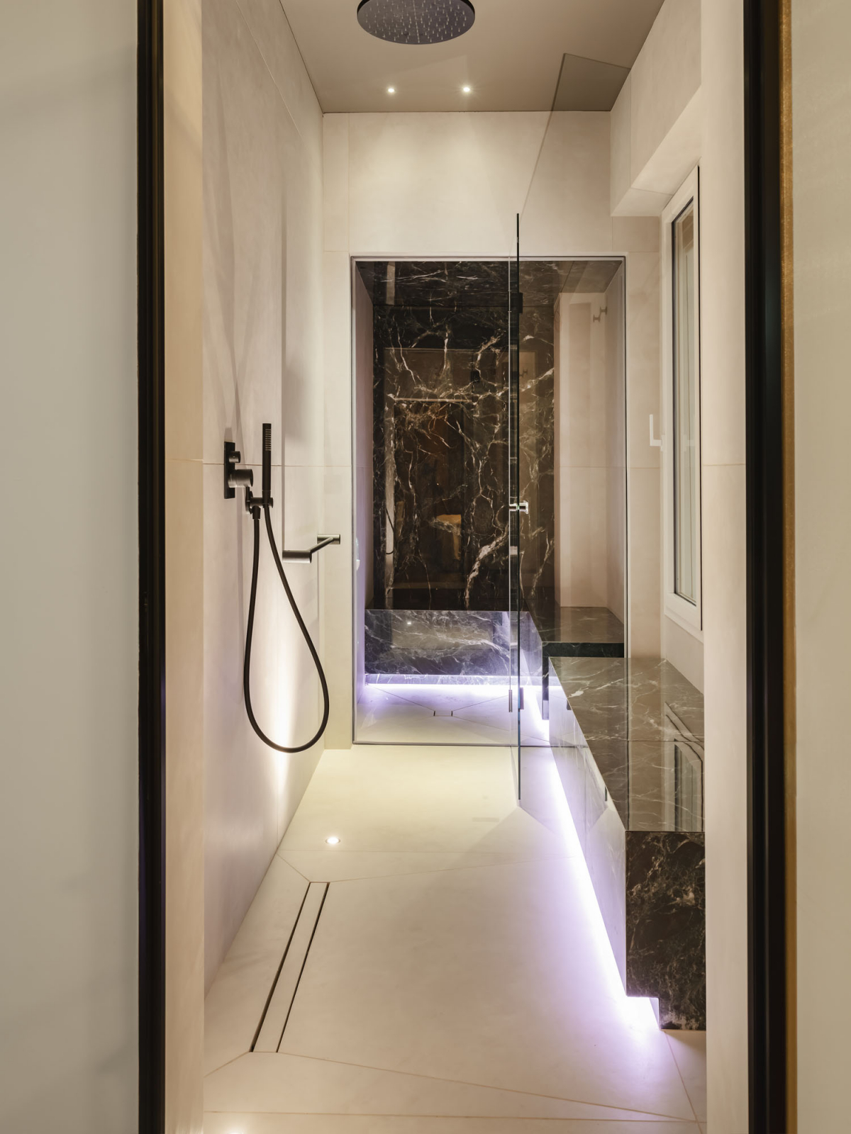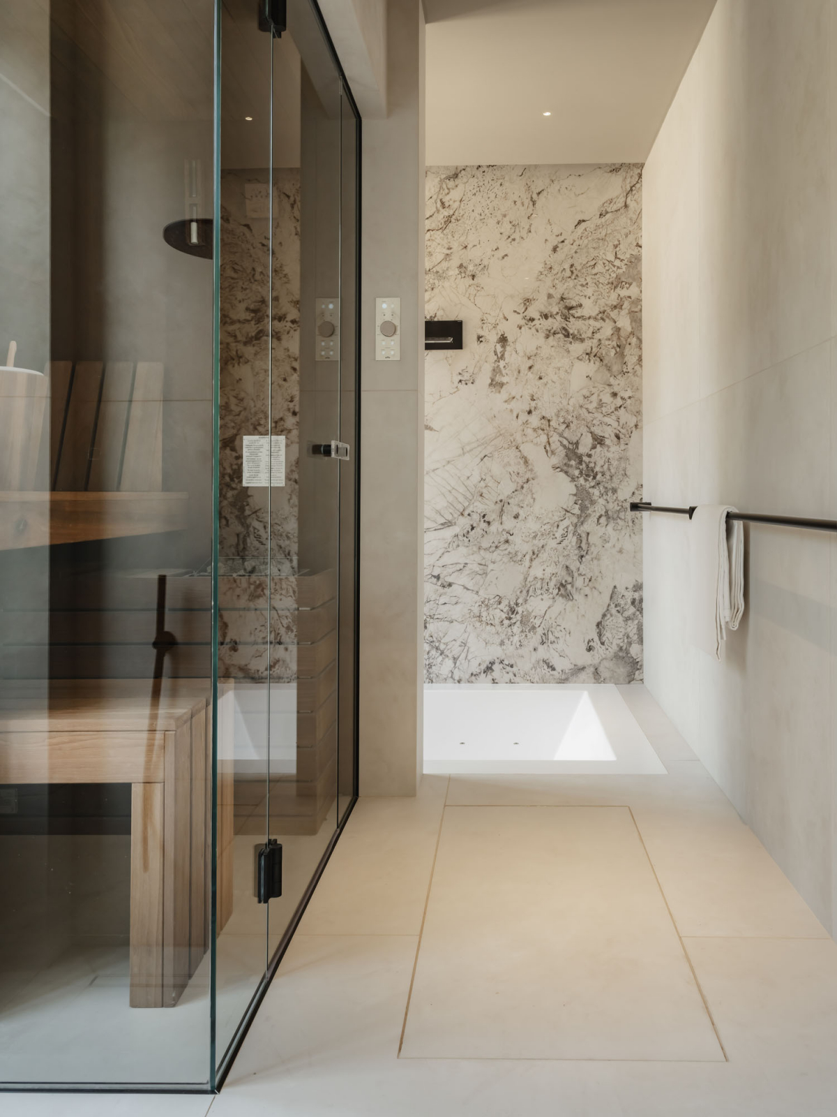 Nella Spa delle Suites San Tommaso a Bari, progetto dell’architetto Valentina Longo, l’intervento richiama l’esperienza immersiva e la matericità della superficie diviene strumento di orientamento sensoriale. L’architetto ha scelto due soluzioni del brand: l’effetto cemento-resina di Join, nel colore Moon (120×120), e l’effetto marmo Anima Wonder nelle varianti Forest (60x120 e 120×278) e Glacier (120×278). La gerarchia dei formati consente di modulare i volumi interni e rendere più fluida la relazione tra parete, pavimento e involucro vetro. Le finiture definiscono un registro materico che regola la profondità visiva e accompagna la direzione della luce, facendo della ceramica un componente attivo nella narrativa dell’architettura del benessere.