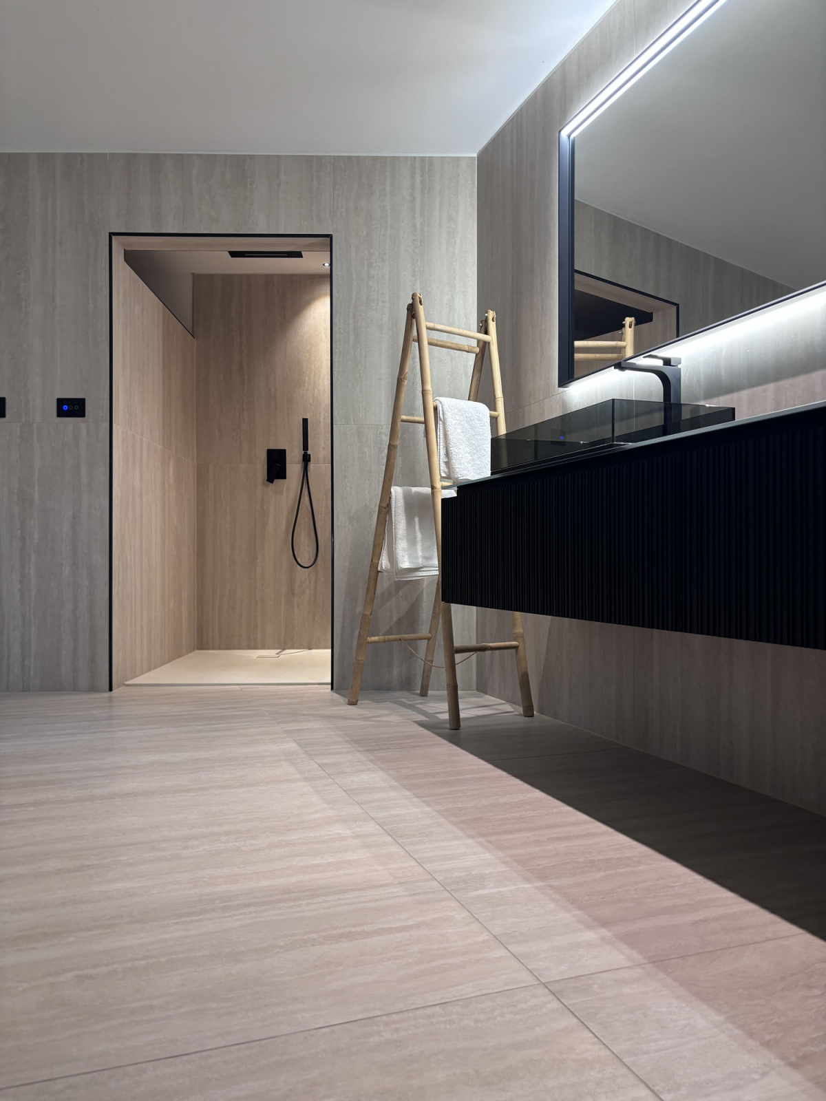 Il bagno ha assunto una condizione spaziale compiuta: è un luogo dove ogni superficie, ogni riflessione luminosa e ogni linea di fuga partecipa alla definizione dell’architettura. In questo campo progettuale, la scelta della superficie ceramica assume rilievo come decoro ma anche come operatore di misura, per proporzione, continuità e coerenza materica.