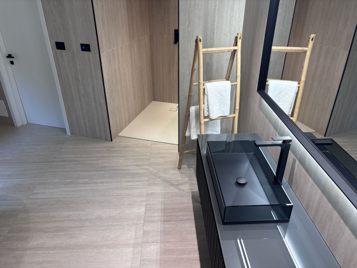 In un appartamento privato a Merano, il bagno è stato concepito come spazio silenzioso e ordinato. Per le superfici è stata scelta la collezione Iconica di Caesar, nella variante Classico verso (formati 120×120 a pavimento, 60×120 a rivestimento), finitura Matt TP RT R10B. La continuità tra pavimento e pareti elimina interruzioni visive e rinforza la misura spaziale: il formato e l’effetto travertino offrono una percezione stratificata della luce riflessa, calibrata e piacevolmente diffusa. Il risultato è un ambiente in cui la ceramica partecipa alla costruzione volumetrica del bagno.