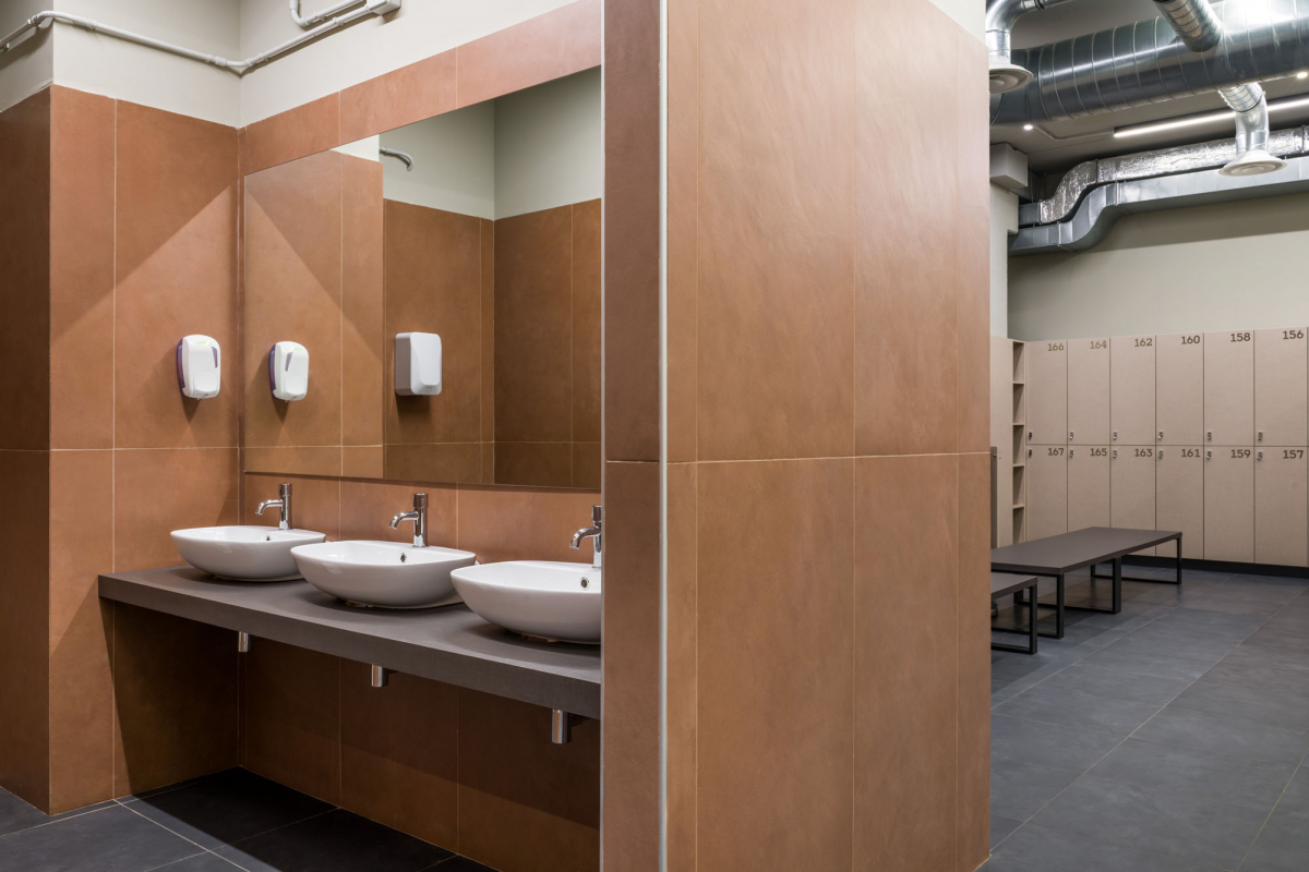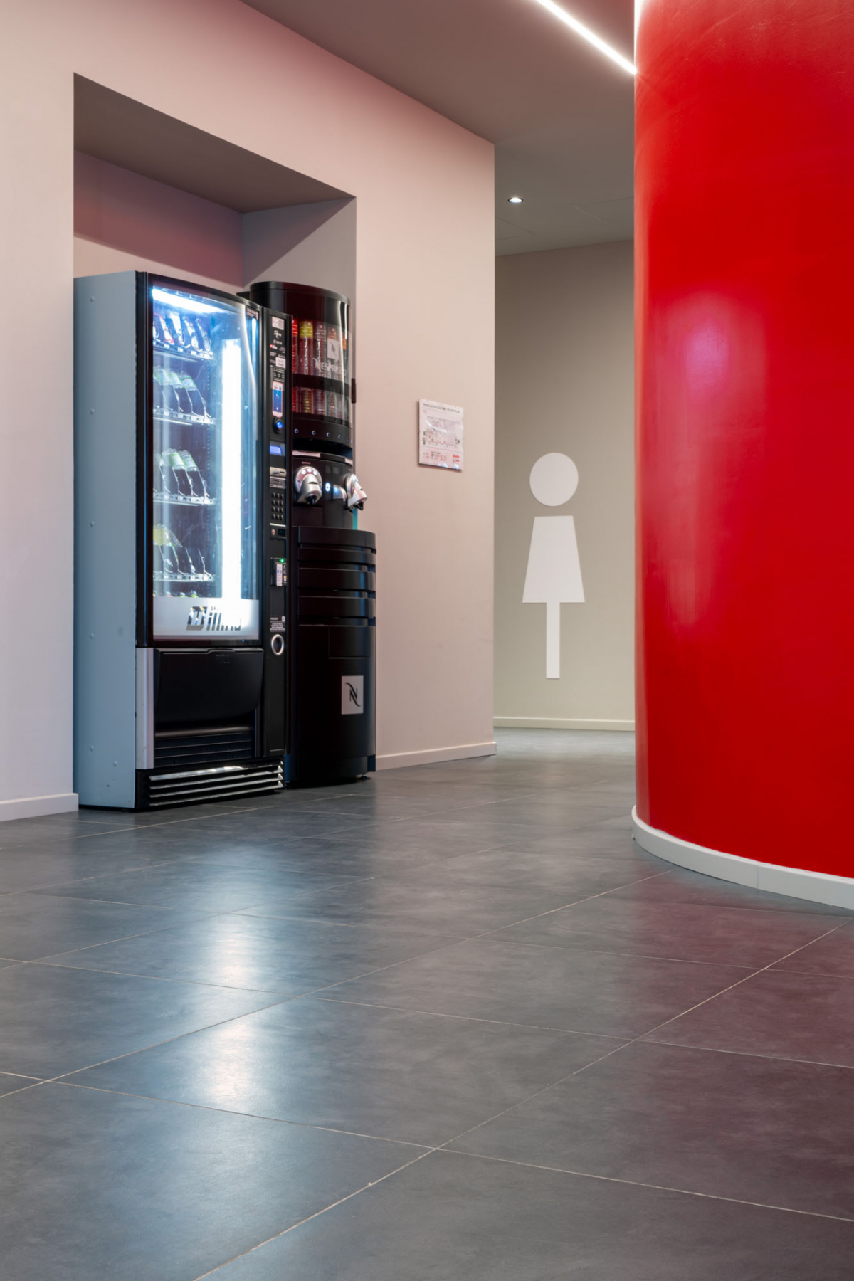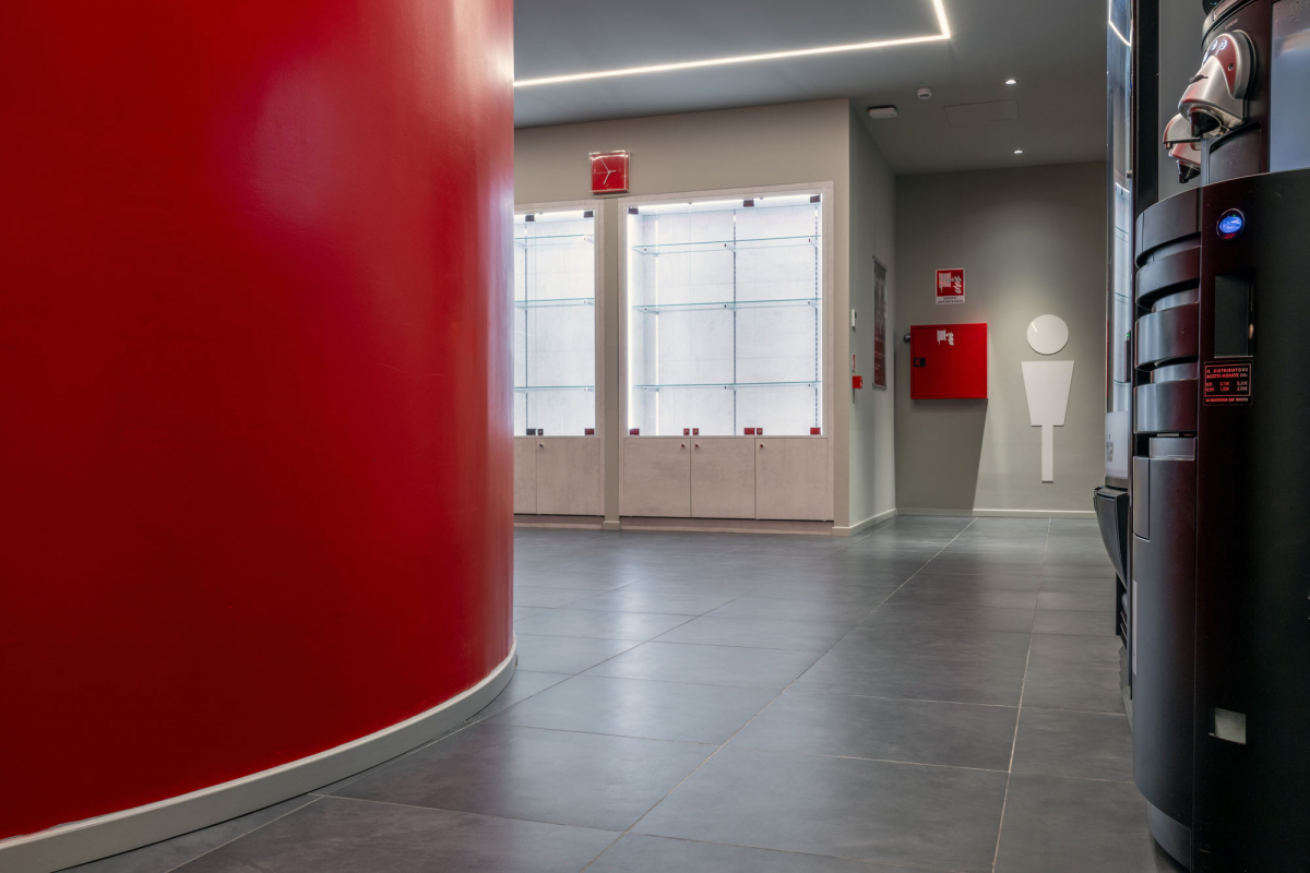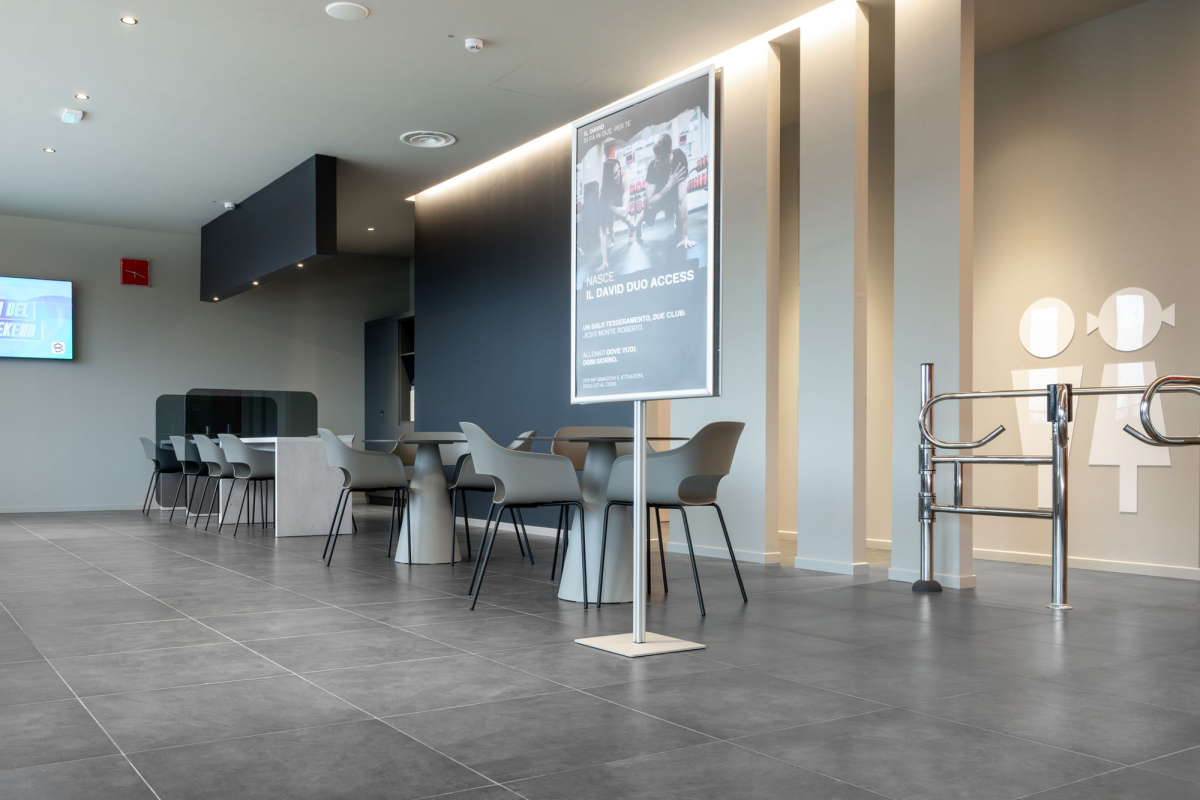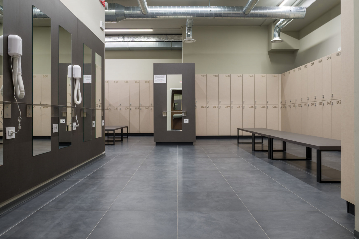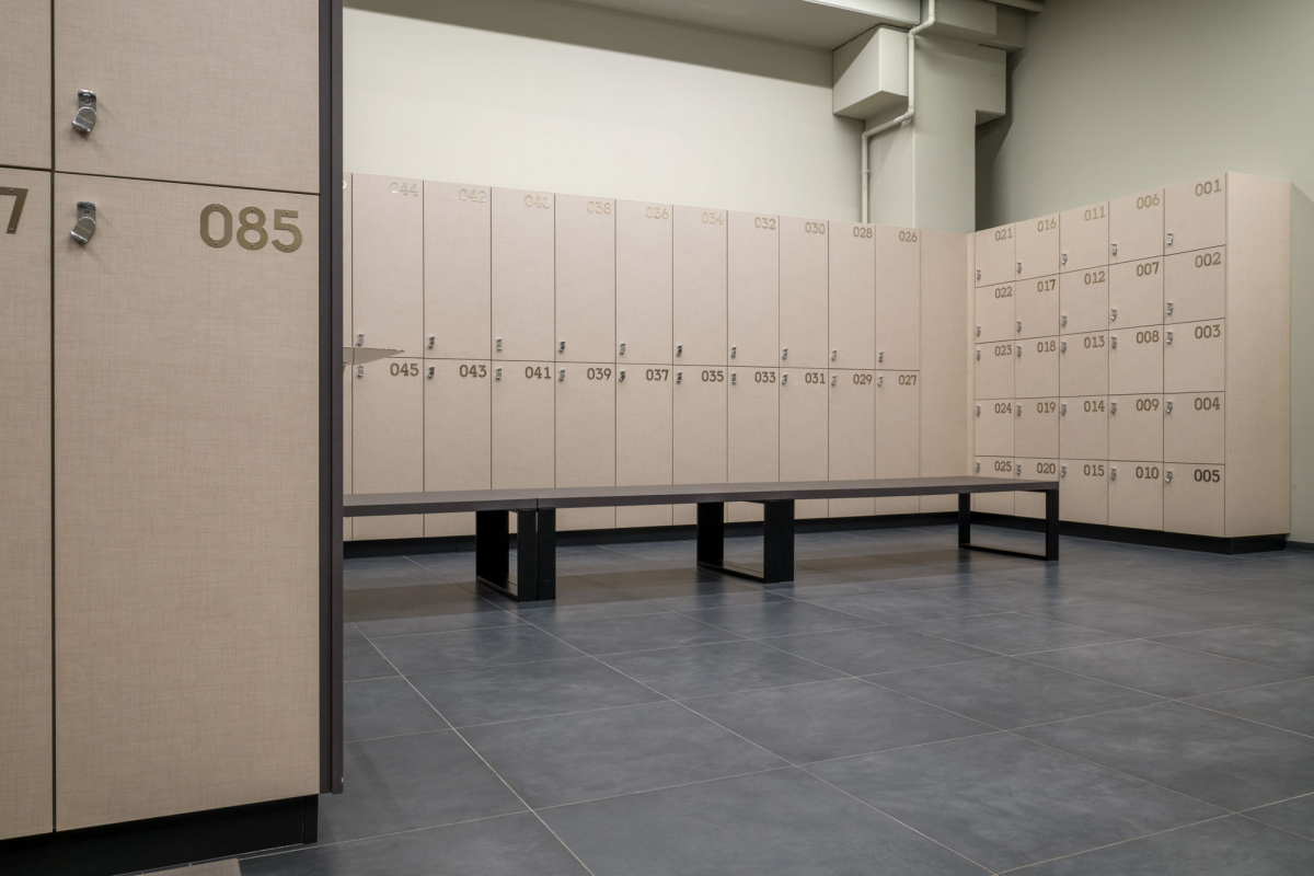 Gli spogliatoi femminili impiegano a rivestimento anche gli accenti colore Spice 60x120 Soft, mentre quelli maschili utilizzano Verve 60x120 Soft, che contribuiscono a caratterizzare gli spazi con calore e contemporaneità. Gli ambienti destinati agli ospiti e al personale proseguono la stessa logica con Levity 60x120 Soft, applicato sulle superfici verticali. Ogni variante si inserisce in un quadro cromatico e materico condiviso, introducendo differenziazioni affidate alla sfumatura e alla modulazione.