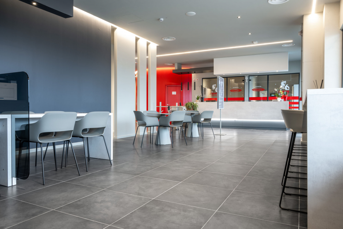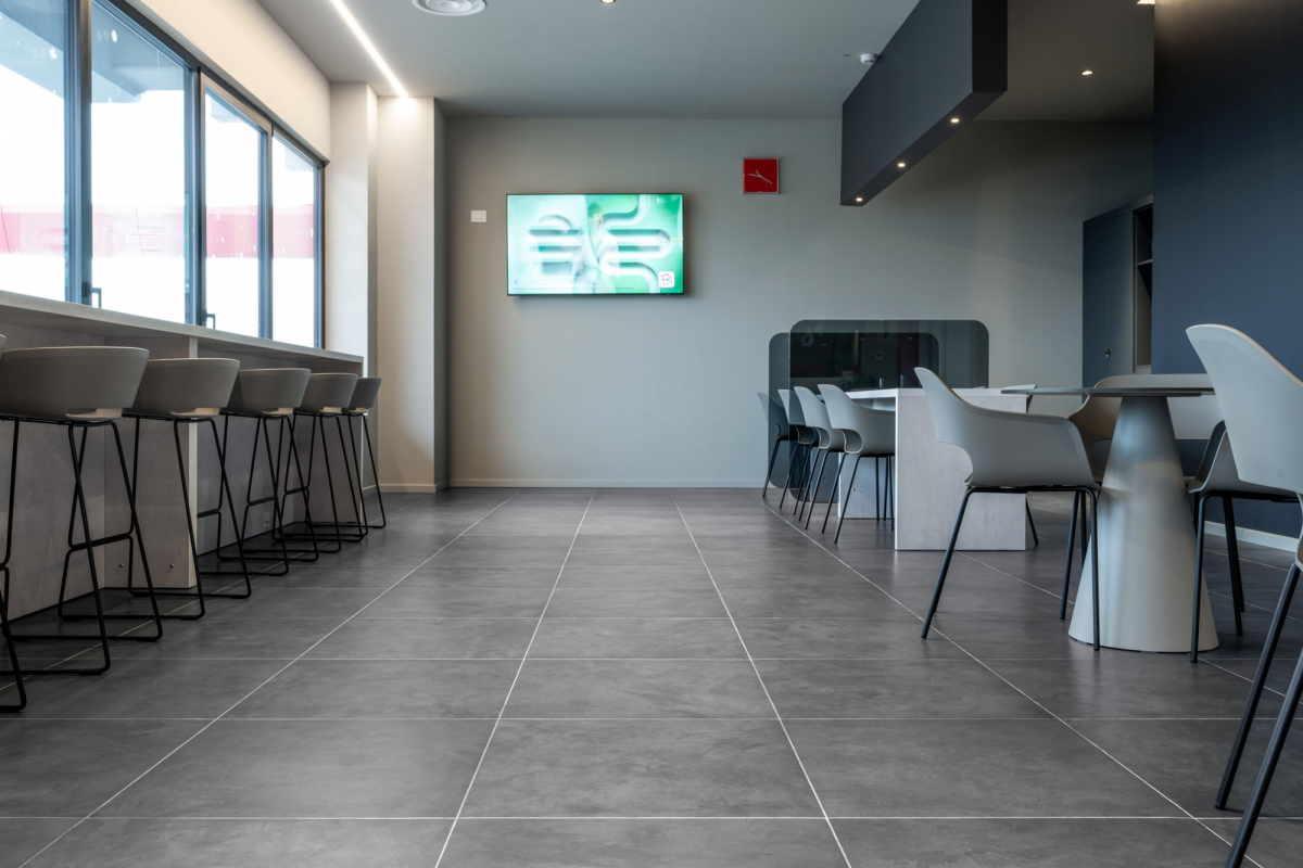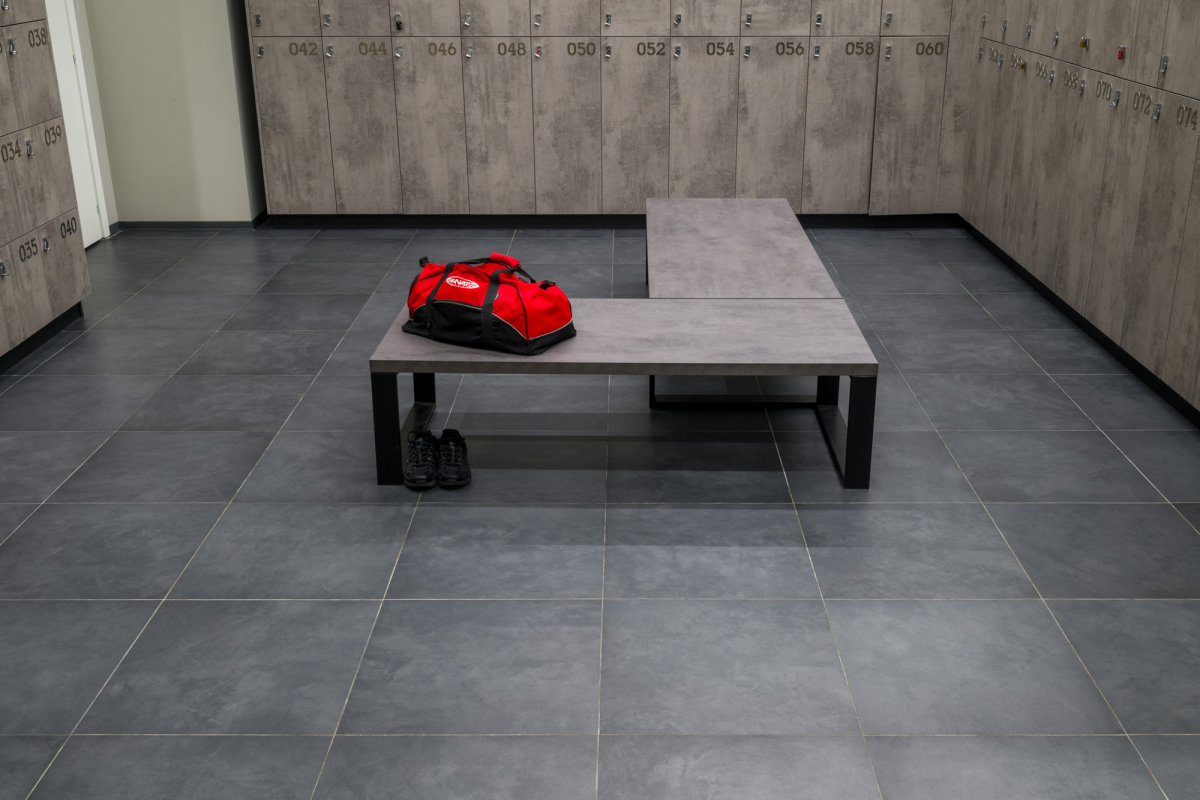 Le aree interne comuni sono pavimentate con Join Chimney 60×60 Soft. La superficie definisce una base misurata e neutra, adatta a zone ad alto traffico e funzionale alla leggibilità degli spazi e alla facilità di gestione. Le aree doccia adottano Join Chimney 60×60 Matt Touch Plus R10B, scelto per la sua idoneità agli ambienti umidi, mantenendo coerenza cromatica e rispondendo a specifiche esigenze funzionali.