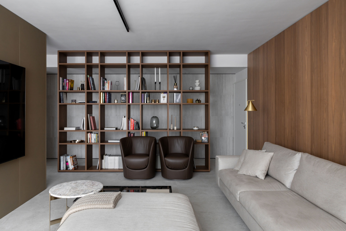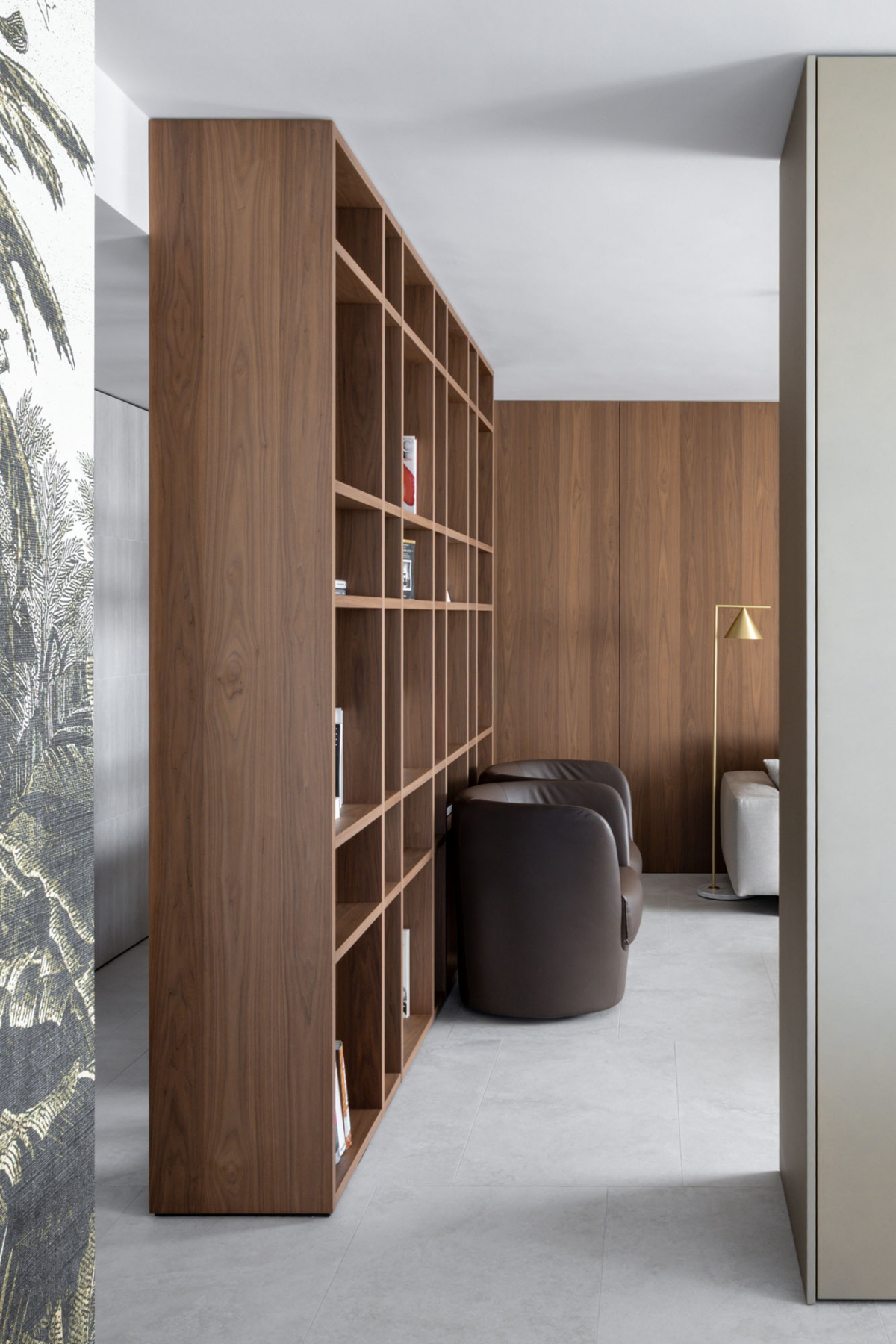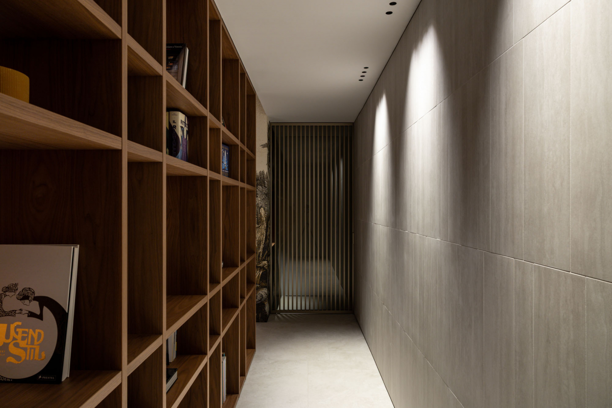 All’ingresso, dove una libreria in noce canaletto funge da soglia narrativa verso la zona giorno, Navona Verso compare come rivestimento con posa multiformato. La texture longitudinale della lastra viene scomposta in moduli di piccolo formato, producendo una superficie grafica compatta accanto alla massa del legno.