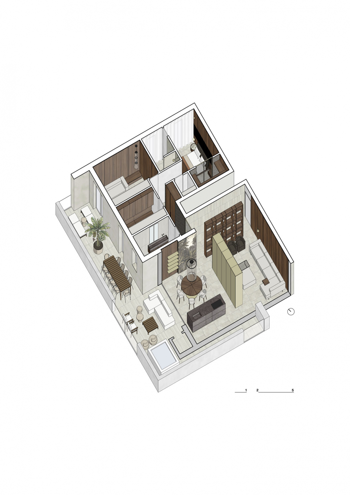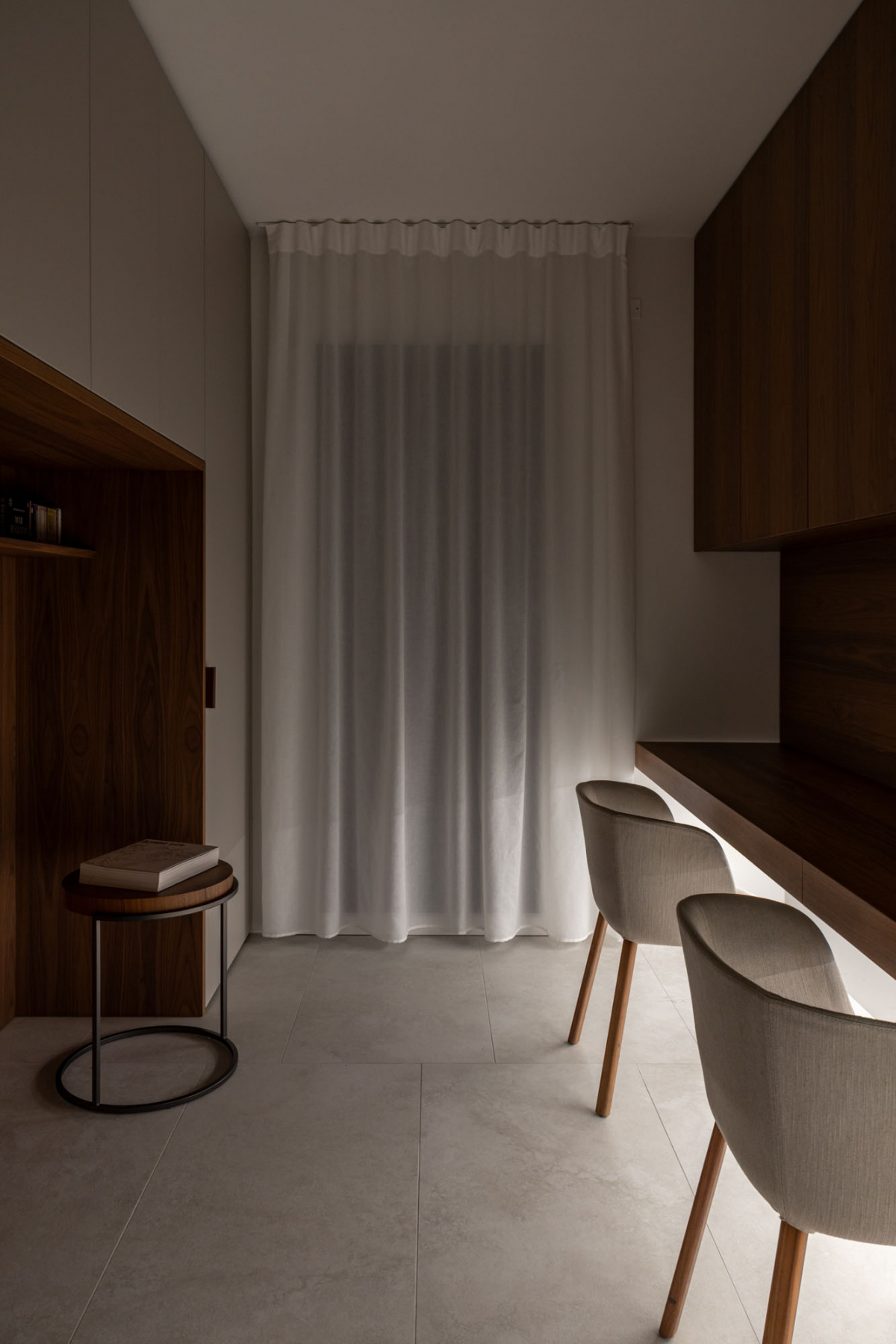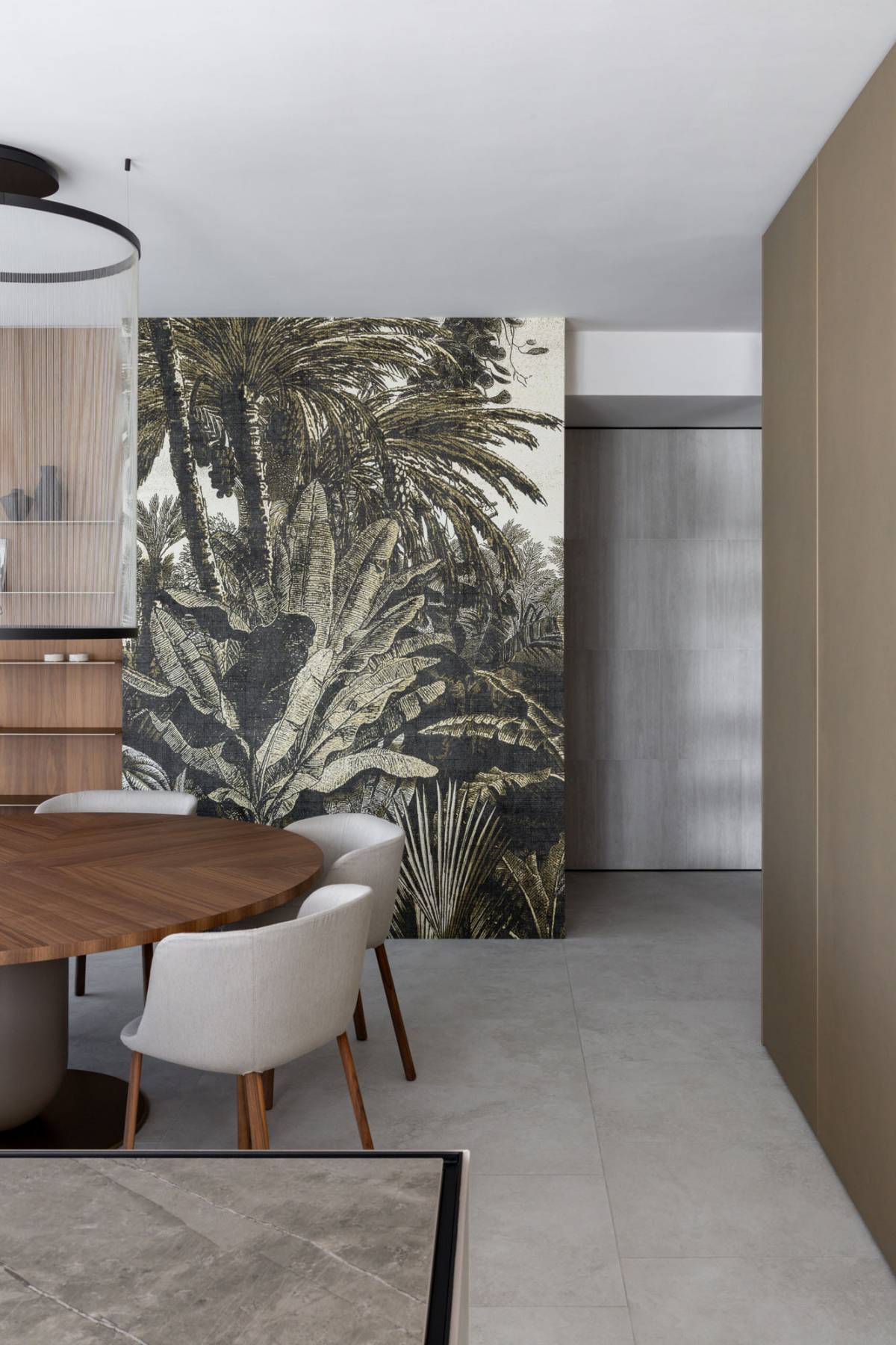 All’ingresso, dove una libreria in noce canaletto funge da soglia narrativa verso la zona giorno, Navona Verso compare come rivestimento con posa multiformato. La texture longitudinale della lastra viene scomposta in moduli di piccolo formato, producendo una superficie grafica compatta accanto alla massa del legno.