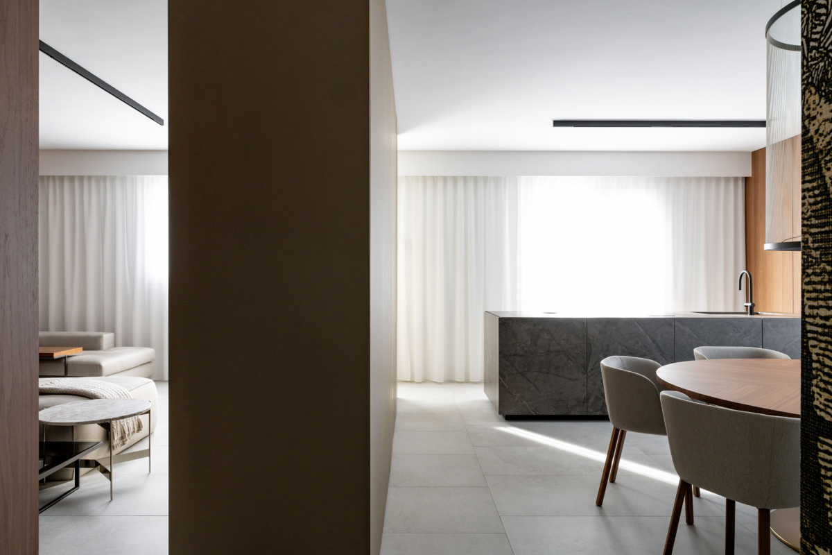 Per i pavimenti e i rivestimenti dell’appartamento, Studio Eigen ha scelto la collezione Iconica di Caesar: superfici in gres porcellanato ispirate al travertino che si estendono dal soggiorno alla zona notte e tornano sulle pareti dei bagni e dell’ingresso, stabilendo la base cromatica e percettiva dell’intervento. Opera Prima si organizza intorno al rapporto tra queste superfici e le colonne in metallo liquido champagne che segnano la transizione tra soggiorno e pranzo, in un equilibrio che il titolo stesso dichiara.