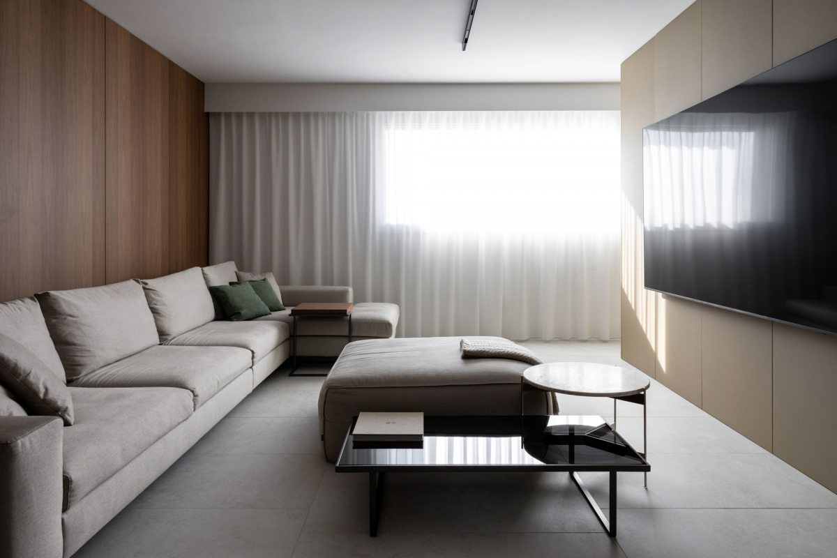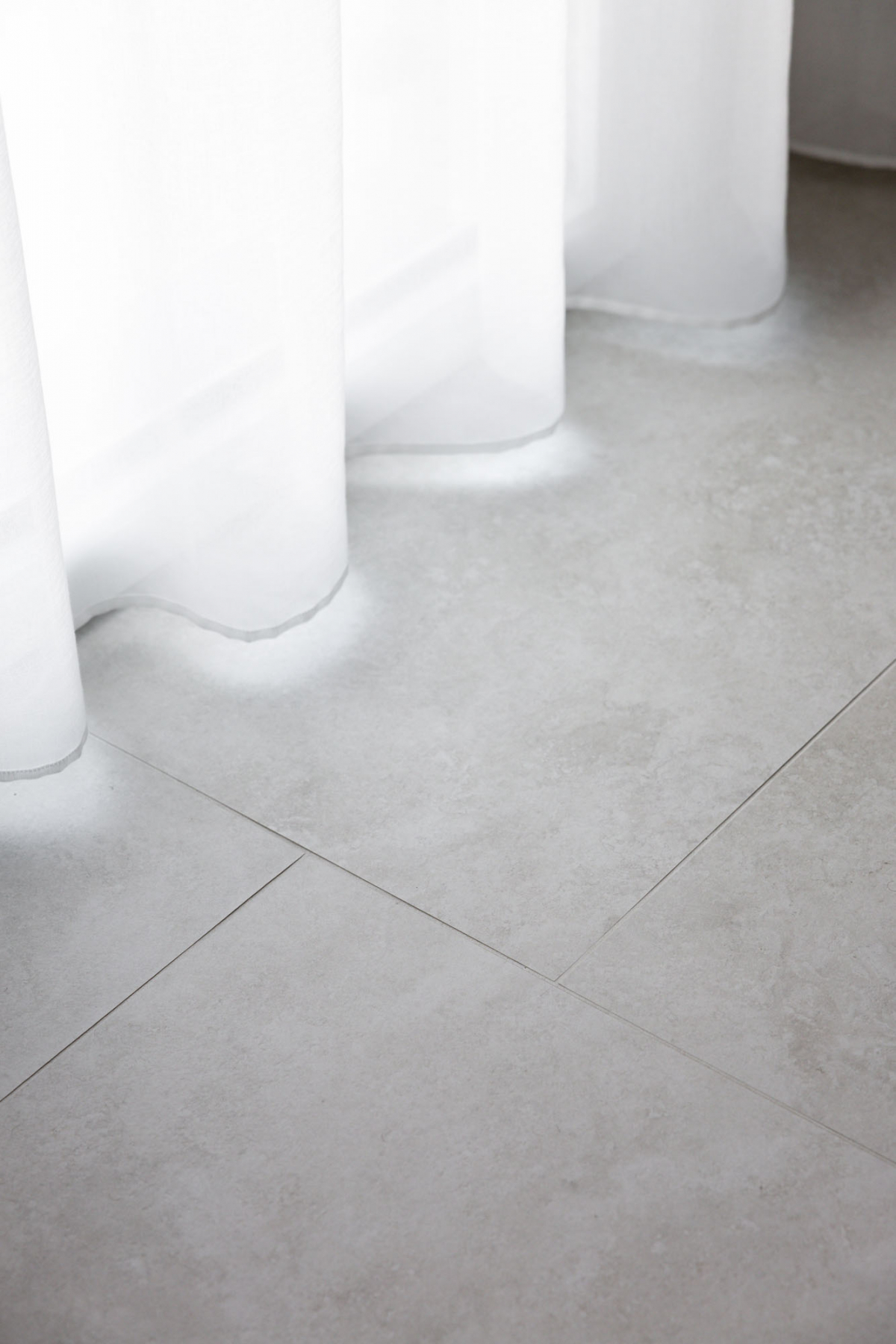 Il pavimento interno è realizzato con lastre 60x120 di Navona Contro: le ampie lastre si stendono in un ritmo asimmetrico su tutto il piano orizzontale dell’appartamento.