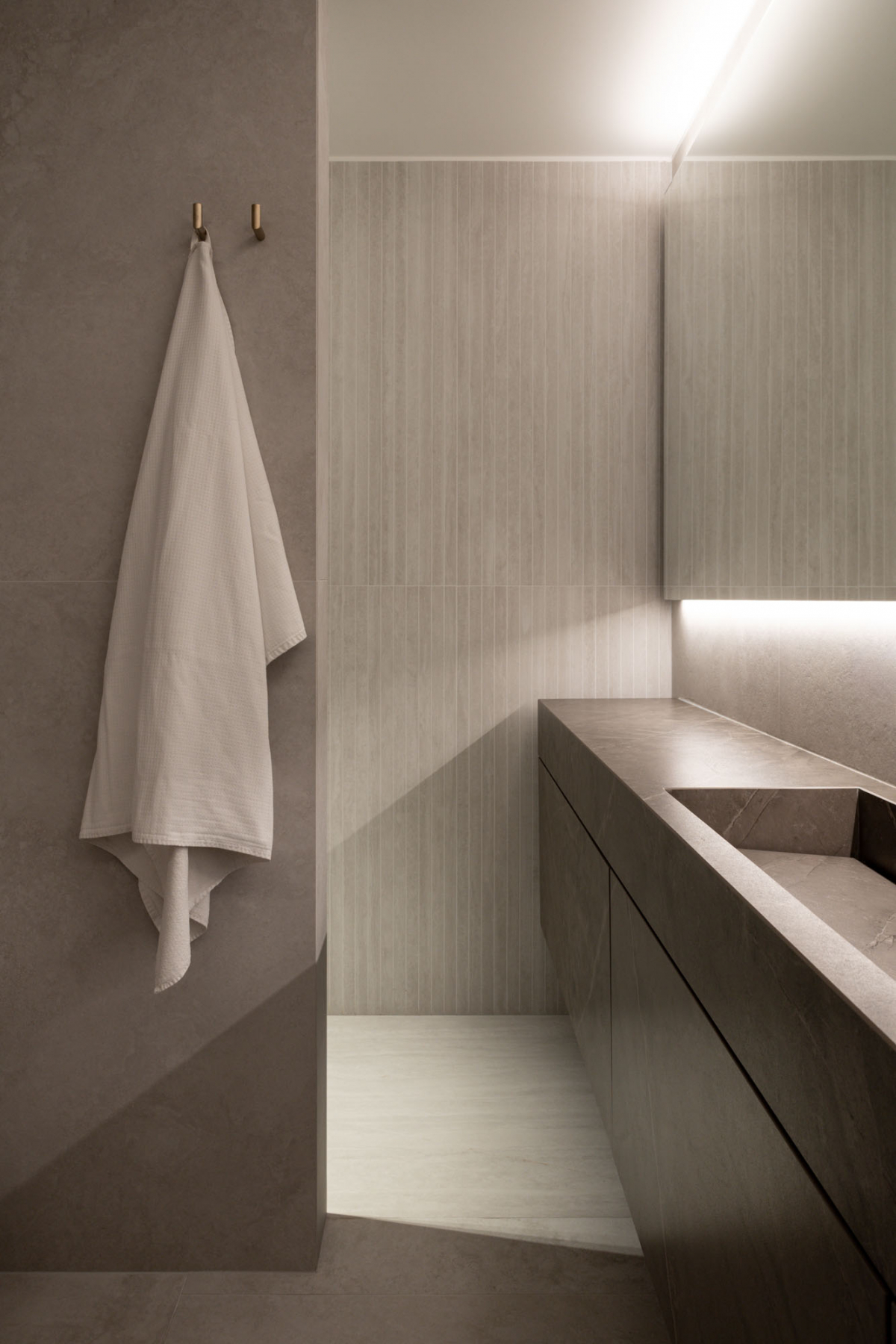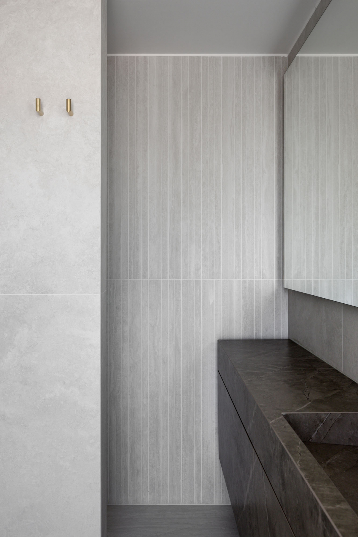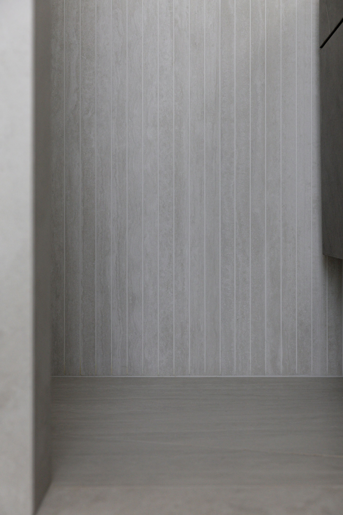 Nei bagni il progetto sviluppa due soluzioni distinte. Nel bagno di servizio le pareti sono rivestite con Navona Verso Straight 60x120 in posa verticale: le scanalature della fresatura incidono la superficie restituendo profondità e disegno.