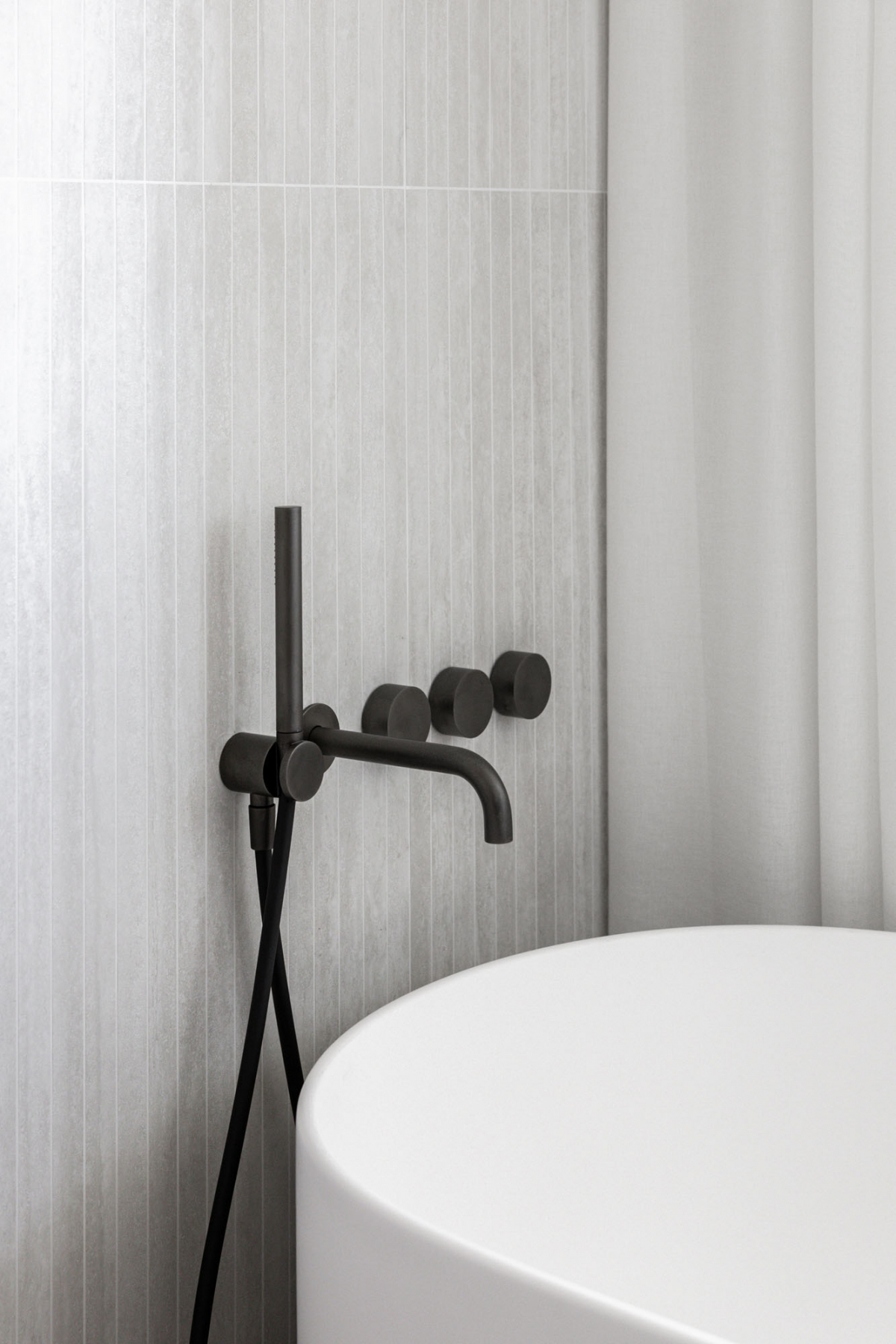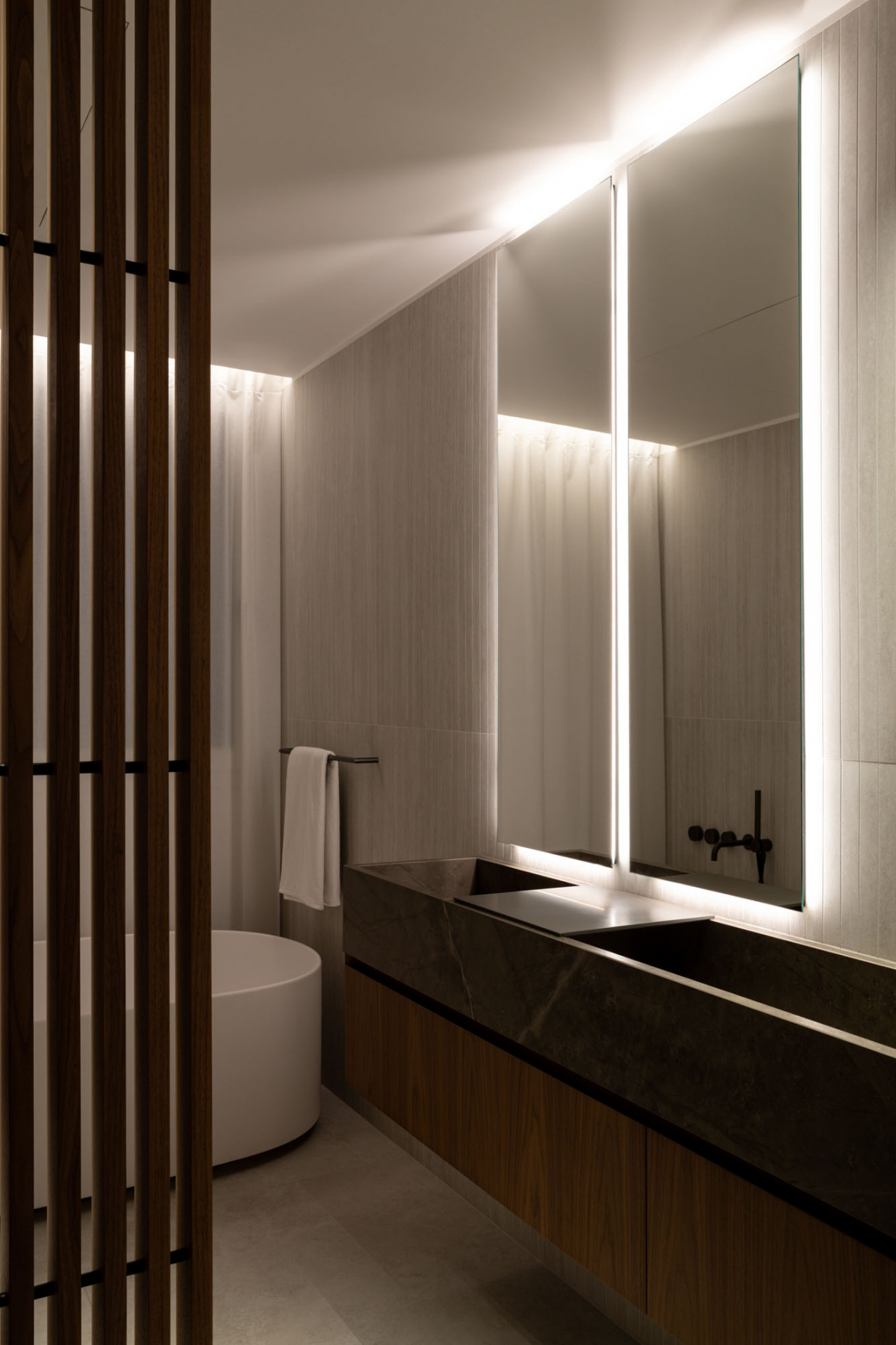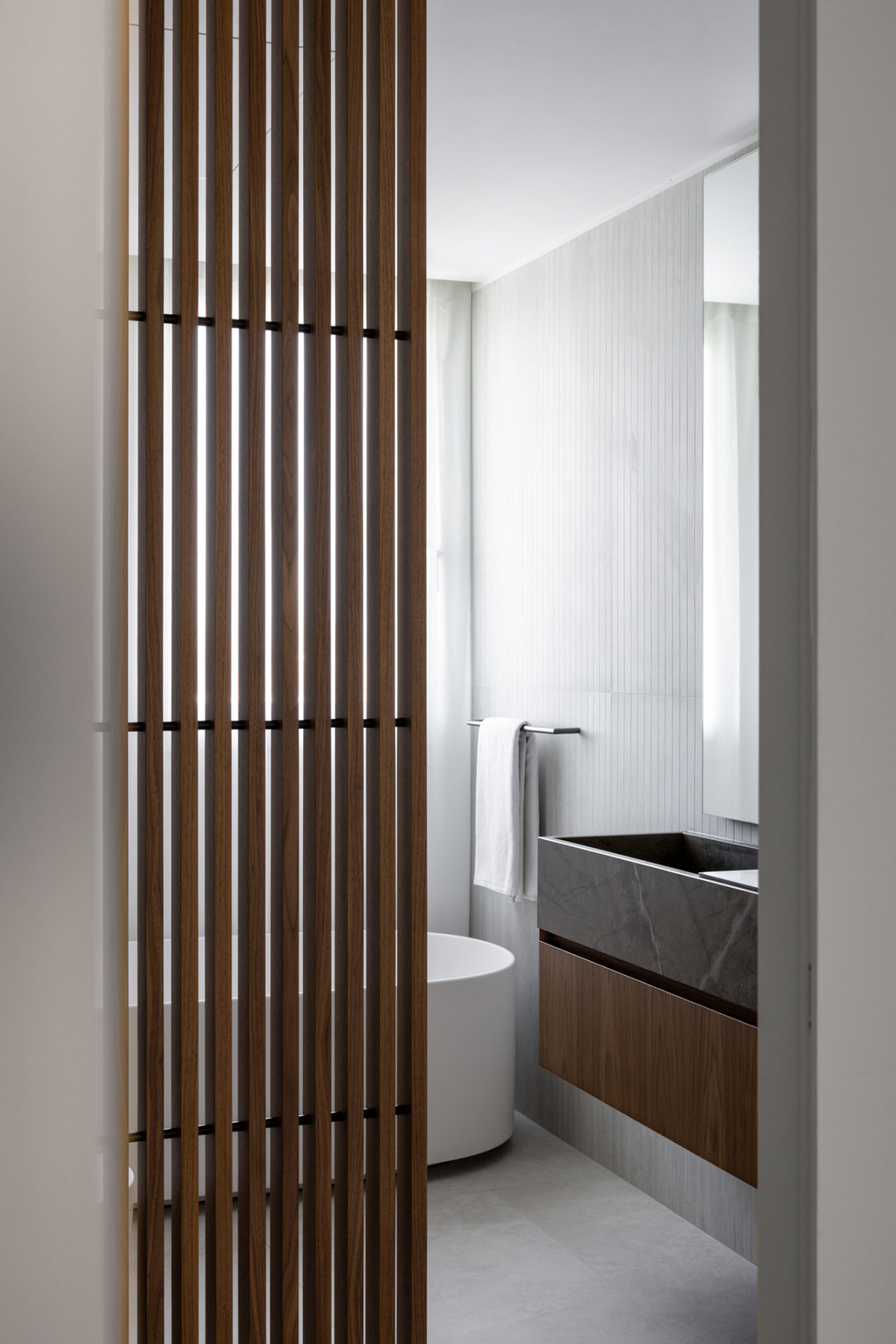 Nei bagni il progetto sviluppa due soluzioni distinte. Nel bagno di servizio le pareti sono rivestite con Navona Verso Straight 60x120 in posa verticale: le scanalature della fresatura incidono la superficie restituendo profondità e disegno.