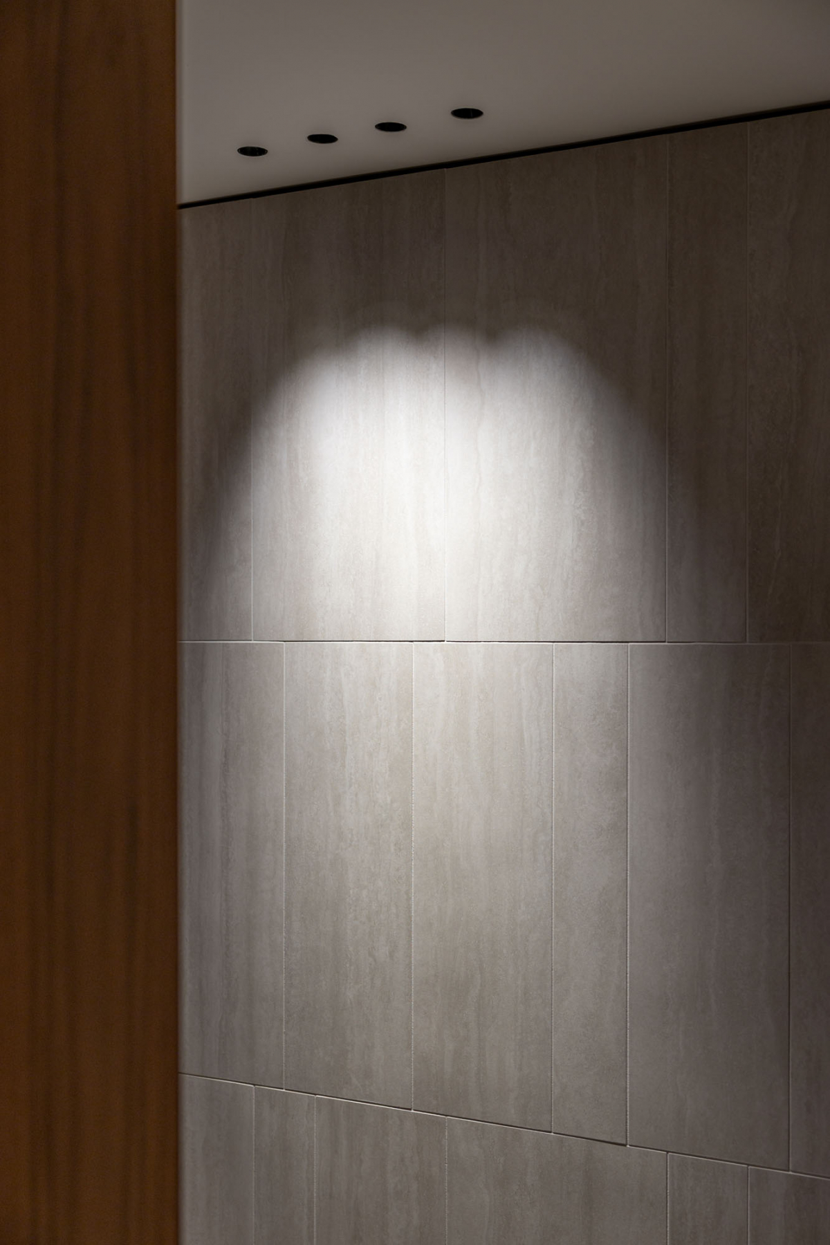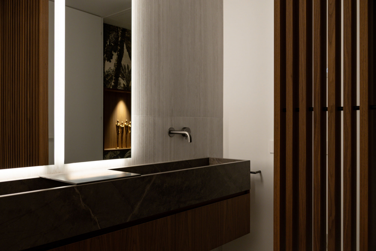 Studio Eigen utilizza la variante Navona, la più luminosa delle tre colorazioni della collezione Iconica, attraverso due configurazioni grafiche complementari: Navona Contro, caratterizzata da arabeschi di sfumature nuvolate, e Navona Verso, definita da striature longitudinali. A queste si affianca Navona Verso Straight, decoro ottenuto per fresatura della lastra 60×120 che introduce scanalature verticali sulla superficie.